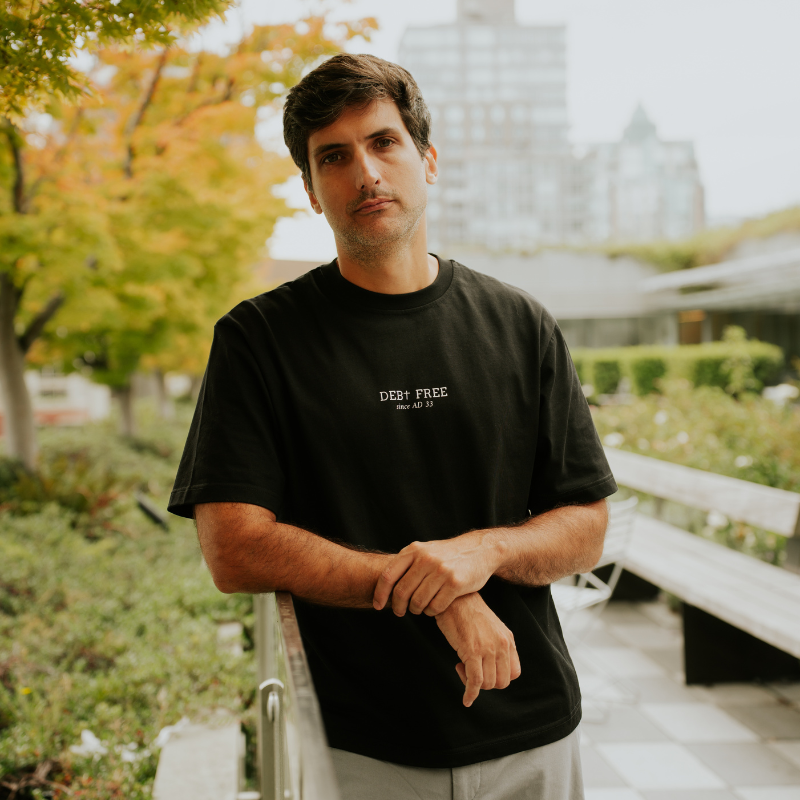 The Debt Free Tee is made from 260gsm high-quality combed cotton, providing a substantial hand feel with a relaxed silhouette and slightly dropped shoulder.