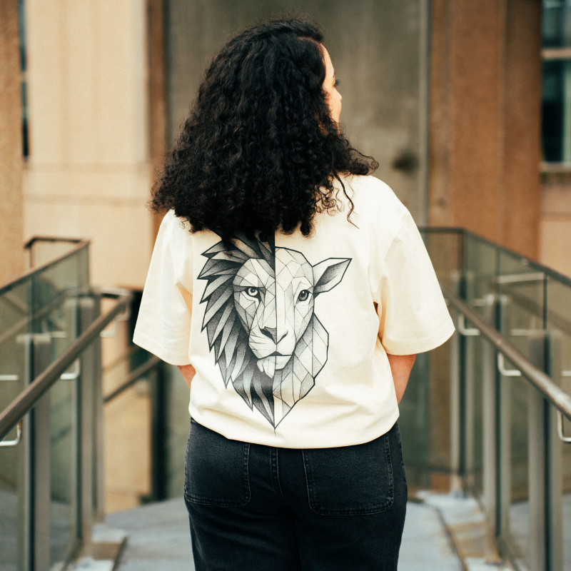 • Back Design → Our iconic geometric "Lamb & Lion" illustration